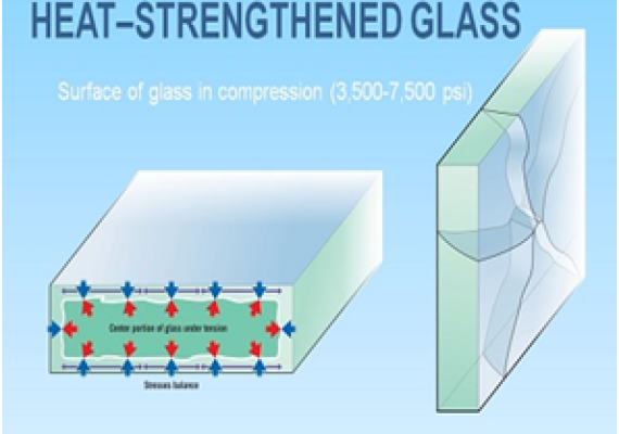 Heat-strengthened glass continues to gain popularity and is often the choice of the design professionals for vertical vision spandrel areas and for laminated sloped glazing. Heat-strengthened glass is valued for its mechanical strength which is twice of normal annealed though half of fully tempered glass. Heat strengthened glass has a comparatively flatter finish than fully tempered glass. It therefore has lesser optical distortions and so can be used in places where high optical quality is required. It can be used for general glazing where additional strength or resistance to mechanical/thermal loads caused by certain tinted or coated glass. The glass can also be used in high wind load areas, but IT CANNOT BE USED IN ANY SAFETY GLAZING APPLICATIONS. Heat-strengthened glass is widely used in laminated glass for additional strength, such as in overhead and sloped glazing.